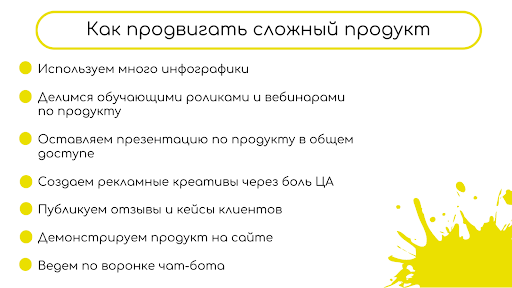 При создании инфографики или креатива, оформлении кейса или текста презентации помните, что продукт создается для клиента. Он же его приобретает, поэтому говорите с ним на его языке. Откажитесь от сложных терминов и подробных описаний технологии вашего решения. Клиенту важнее увидеть, что его боли будут закрыты, а проблемы решатся. Тогда и покупка не заставит себя долго ждать.