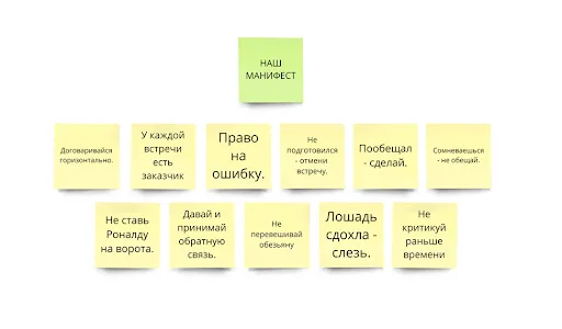 Такие правила взаимодействия создаем на стратегических сессиях, которые компания принимает как устав и некий “культурный код” и договаривается следовать ему.