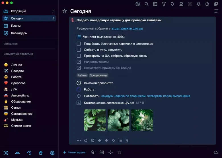 Работа строится вокруг списков и проектов с глубокой вложенностью подзадач. Задачи группируются по папкам, назначаются сроки, приоритеты и повторения.