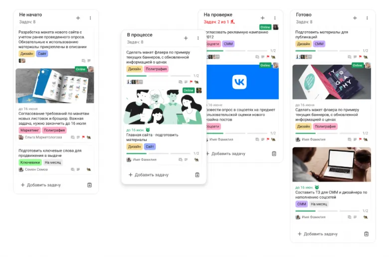 Tasky — простой и наглядный планировщик, построенный вокруг канбан-досок. Создаёте колонки под этапы работы и перетаскиваете между ними карточки задач.