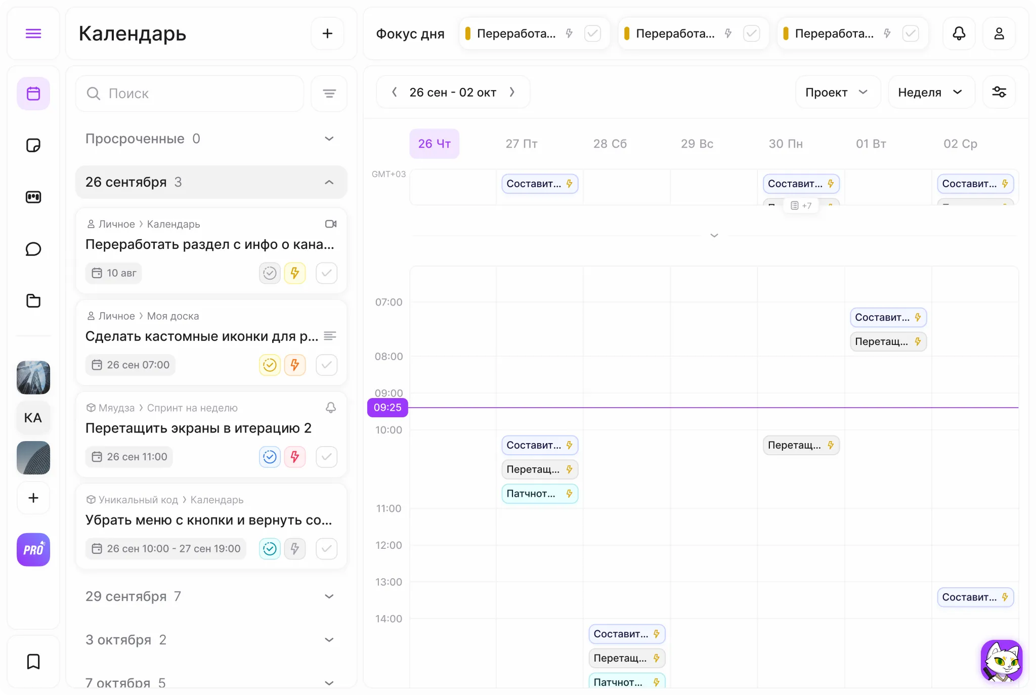Отображение — списком или в календаре. Внутри карточки фиксируются комментарии и напоминания. Доступен фокус-режим, таймер Pomodoro и AI-помощник для структурирования планов.