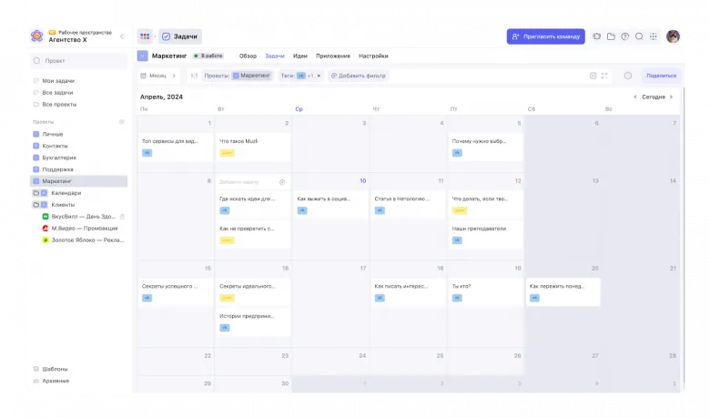 Планировщик доступен в формате списка, канбан-доски и календаря.