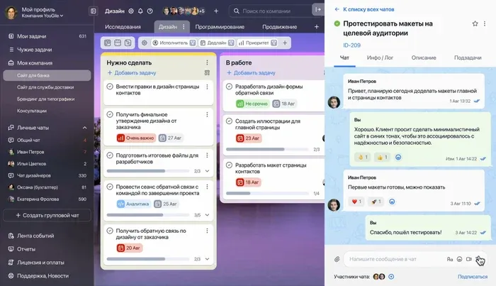 Встроенный мессенджер работает в формате Telegram. Есть личные и групповые чаты, а также отдельные чаты внутри задач — общение остаётся прямо в рабочем процессе.