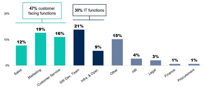 Чаще всего ИИ используют в разработке ИТ-продуктов, маркетинге, клиентском сервисе и продажах. Реже – в HR, юриспруденции, бухгалтерии