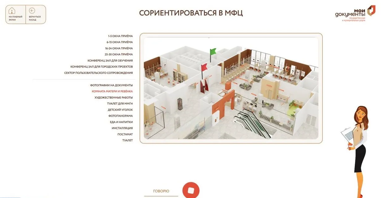 Первая внедрённая версия — в отделении МФЦ. Киоск помогал с записью на прием, навигацией по зданию, выдачей справочной информации и поиском ближайших отделений. Пользователи могли просто сказать «как поменять паспорт» — и получить маршрут, список документов, талон и контактные данные.