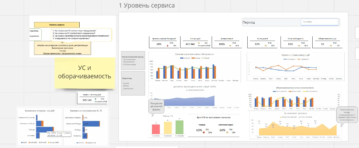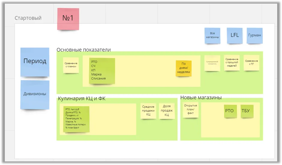В результате проделанной работы был получен следующий результат: прямоугольники с вопросами превратились в макеты дашбордов, отвечающие на те самые вопросы.