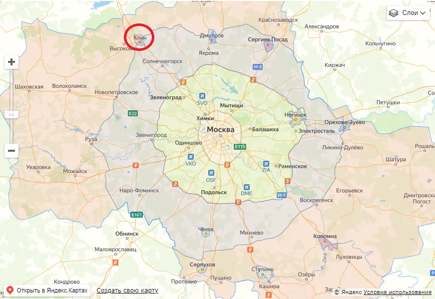 Суть задачи в том, что область доставки представляет собой полигон с некоторым количеством адресов или точек. Некоторые адреса могут входить в состав друг друга. . В таком случае они будут называться «концентрическими» или «вложенными» точками. А часть точек может пересекаться между собой или «перекрывать» другие полигоны — так происходит с городом Клин на скриншоте.