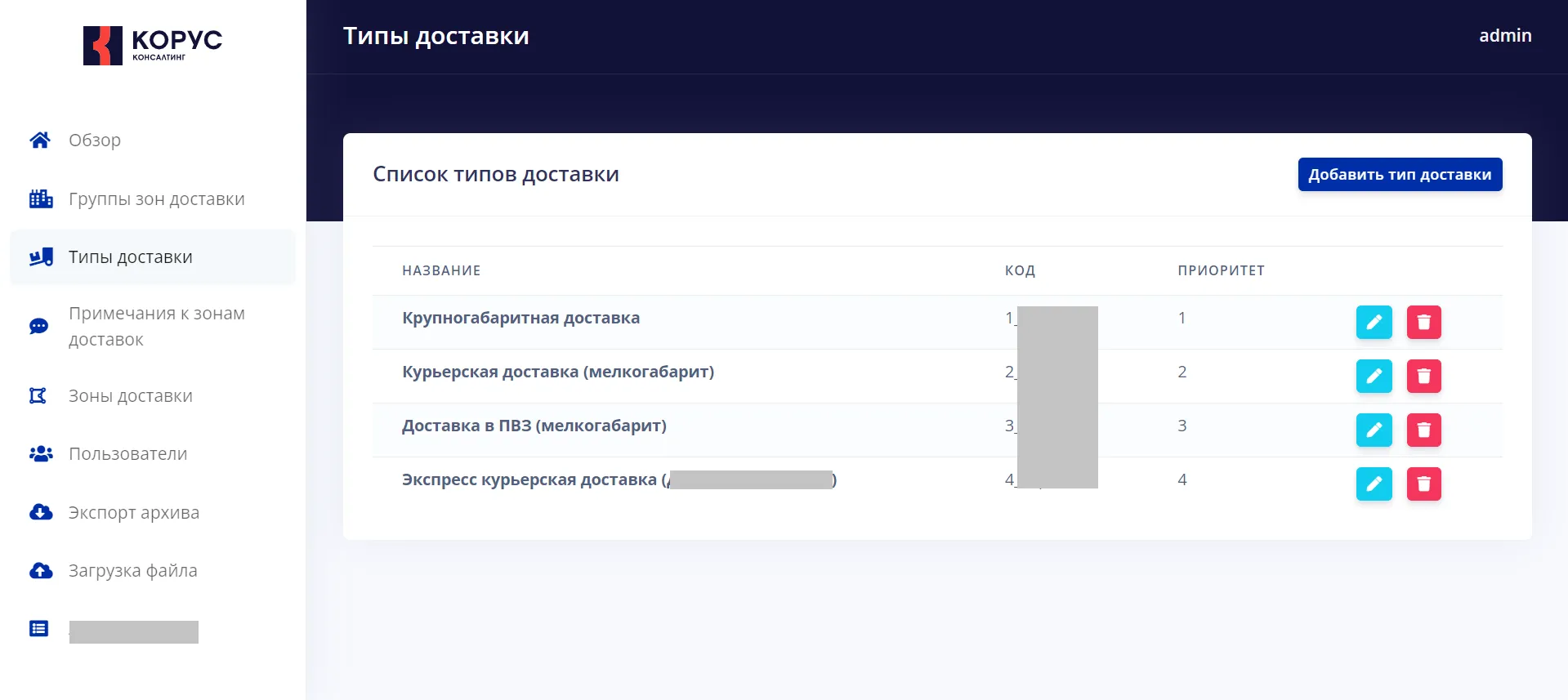 Дополнительно мы реализовали панель администрирования, которая позволяет работать со всем набором данных, имеющих отношение к подсчету стоимости доставки.