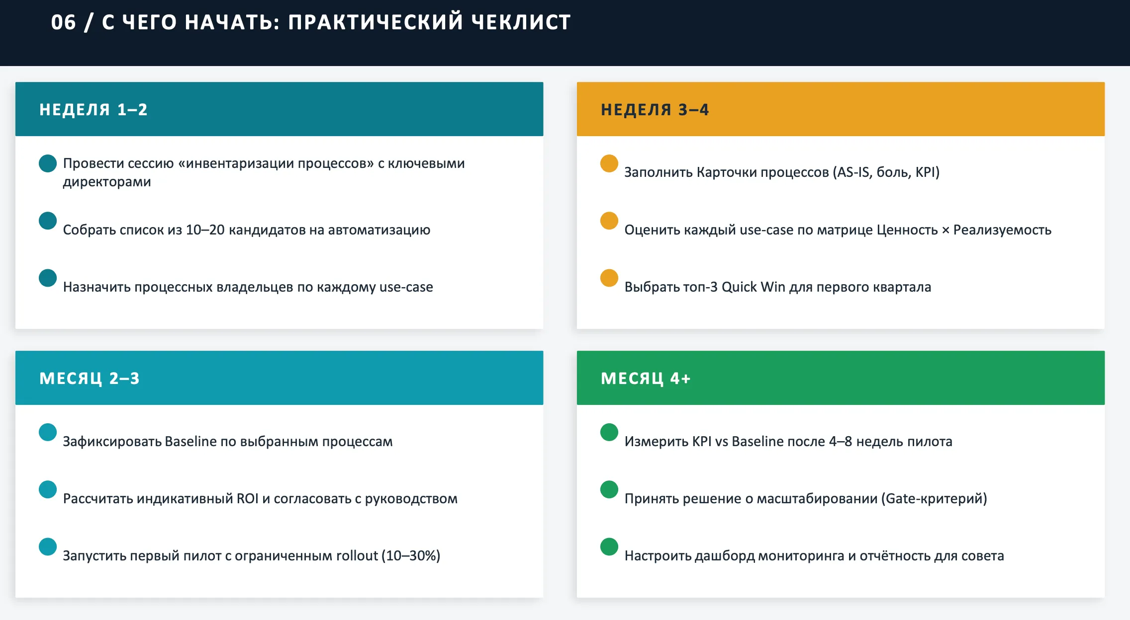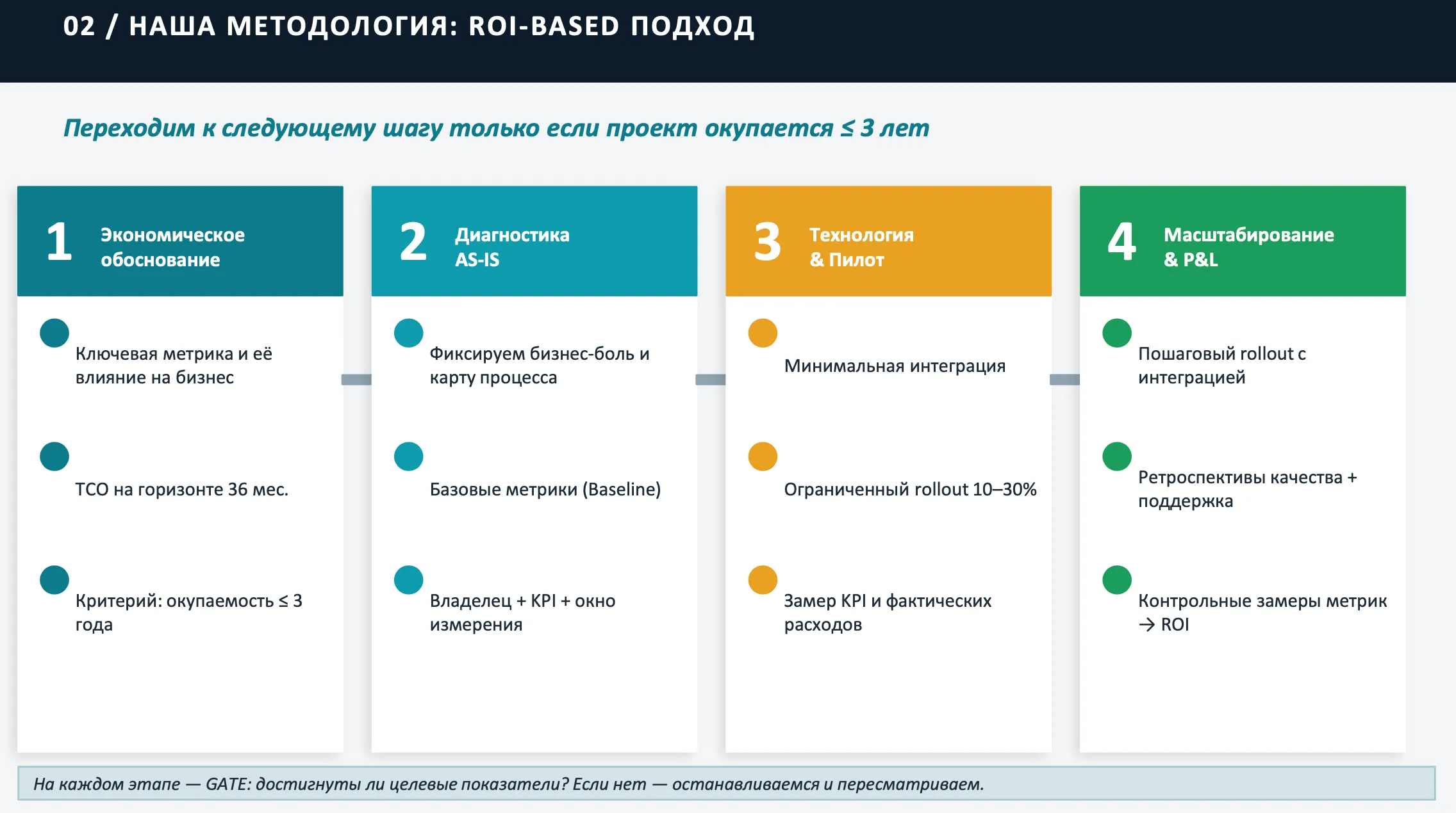 Мне понравилось, что в одном из выступлений эта логика была разложена буквально по шагам: сначала экономическое обоснование, потом диагностика AS-IS, затем пилот с ограниченным rollout, и только потом — масштабирование с контролем KPI и ROI. Причем следующий этап предлагается проходить только если проект окупается в пределах заданного горизонта.