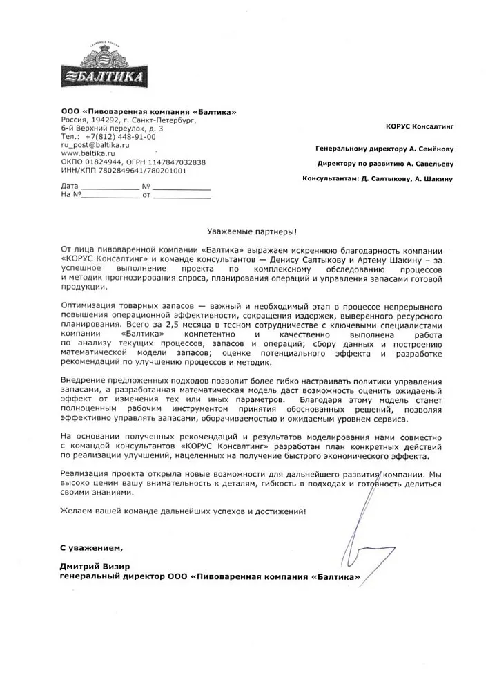 Проанализировали структуру цепи поставок, продуктовую специфику и производственный процесс. Погрузились в нюансы планирования, прогнозирования, товарного распределения и управления запасами As is. Сформировали перечень изменений в процессах и методологии, необходимых для эффективного управления ресурсами. Построили математическую модель целевых запасов и операций, рассчитали на ее основе потенциальный экономический эффект. Компания уже начала работу по внедрению рекомендаций. Математическая модель используется в качестве прототипа для запуска аналитического инструмента, разрабатываемого на базе ИТ-ландшафта «Балтики».