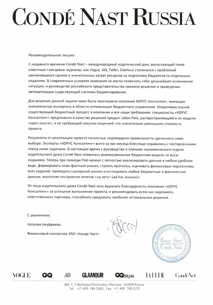 По результатам проекта у нас появилась взаимоувязанная бюджетная модель по всем изданиям. Теперь при помощи Palo можно с легкостью анализировать данные в любом удобном виде, формировать план-фактный анализ, строить прогнозы, оценивать финансовые перспективы всех изданий, проводить сценарный анализ и исследовать любые бюджетные и фактические данные, выполняя построение отчетов «на лету». Это значительно повышает оперативность получения достоверной информации и минимизирует время принятия управленческих решений.