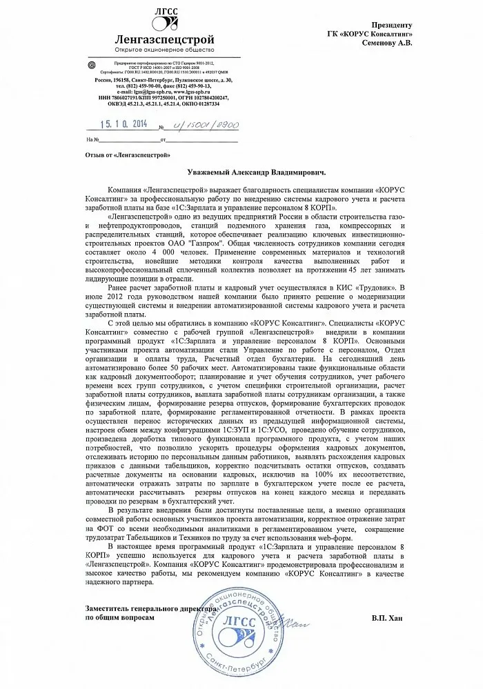 Внедрение системы кадрового учета и расчета заработной платы на базе «1С: Зарплата и управление персоналом 8 КОРП» в компании «Ленгазспецстрой»