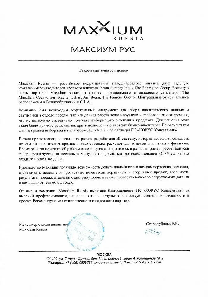 Maxxium Russia — российское подразделение международного альянса двух ведущих компаний-производителей крепкого алкоголя Beam Suntory Inc. и The Edrington Group. Большую часть портфеля Maxxium занимают напитки премиального и люксового сегментов: The Macallan, Сourvoisier, Auchentoshan, Jim Beam, The Famous Grouse. Центральные офисы альянса расположены в Великобритании и США.