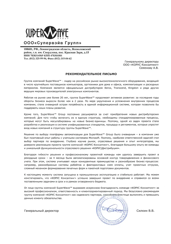ГК SuperWave Group — лидер на российском рынке высокотехнологичного оборудования. Бизнес компании объединяет несколько направлений: дистрибуция офисной техники Xerox, Brother, Powercom; сборка, упаковка и дистрибуция модулей памяти Transcend, Kingston Apacer и Emtec, а также сервисный центр и полиграфическое производство.