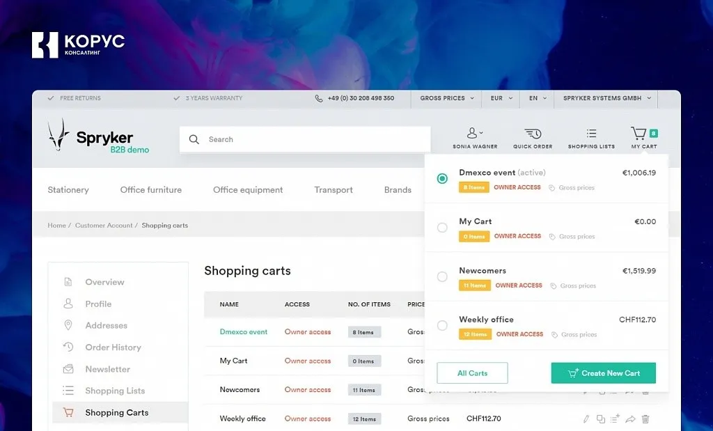 Одна из наиболее интересных возможностей – создание «черновиков» заказов для отработки разных сценариев закупки. Эта важная для многих B2B-компаний функция, которую мы в своих проектах уже давно активно внедряем. «Черновики» заказов особенно популярны среди крупных покупателей, чьи заказы, как правило, очень большие, процедура формирования потребности долгая (месяц, а иногда ещё больше).