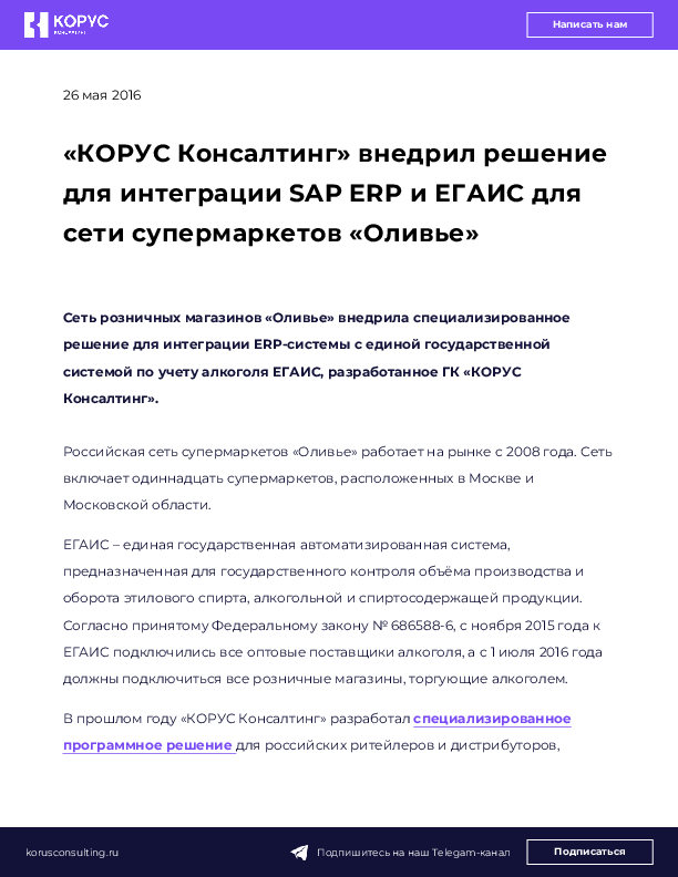 «КОРУС Консалтинг» - одна из первых российских компаний, разработавших решение для передачи данных по учету алкоголя в ЕГАИС, - отмечает Олег Козинский, ИТ-директор, «Оливье». Многолетний опыт работы с системами на платформе SAP, а также широкий портфель проектов в области розничной торговли обусловили наш выбор решения именно этого системного интегратора».