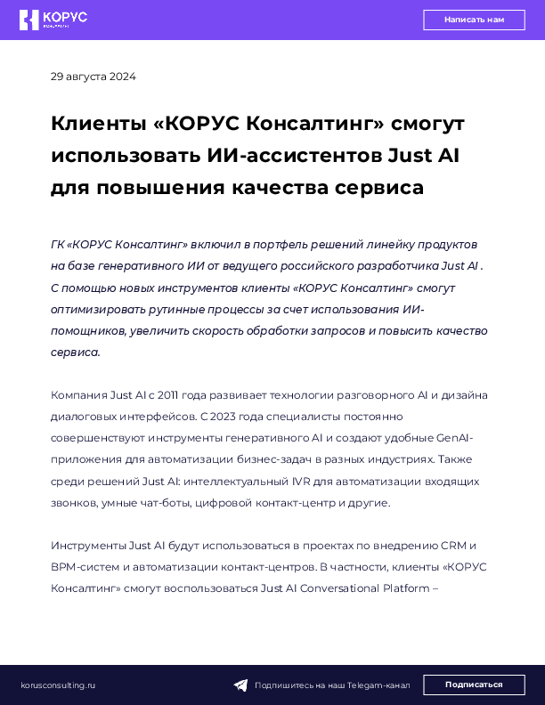 ГК «КОРУС Консалтинг» включил в портфель решений линейку продуктов на базе генеративного ИИ от ведущего российского разработчика Just AI . С помощью новых инструментов клиенты «КОРУС Консалтинг» смогут оптимизировать рутинные процессы за счет использования ИИ-помощников, увеличить скорость обработки запросов и повысить качество сервиса.