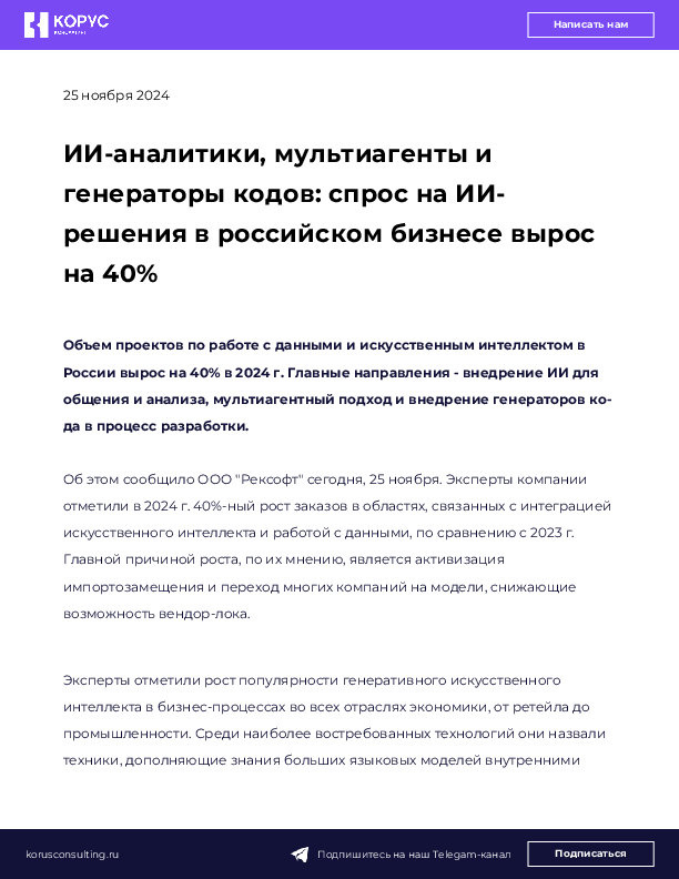 Объем проектов по работе с данными и искусственным интеллектом в России вырос на 40% в 2024 г. Главные направления - внедрение ИИ для общения и анализа, мультиагентный подход и внедрение генераторов кода в процесс разработки.