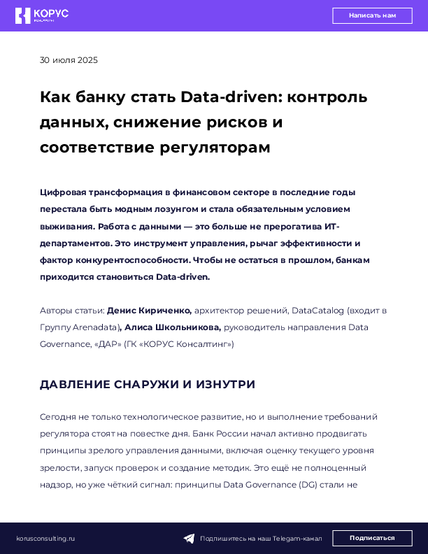 Организации, которые уже начали движение в сторону зрелого управления данными, получают результат быстрее: сокращают сроки отчётности, минимизируют инциденты, упрощают диалог с регулятором, внедряют ИИ без страха. Те, кто откладывает, будут проигрывать не только в скорости, но и в устойчивости.