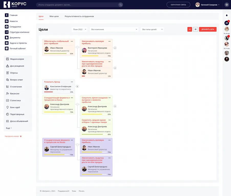 В ответ на потребности крупных ритейлеров мы разработали решение «Управление по целям и KPI». Оно позволяет связать стратегические цели бизнеса с конкретными задачами отдельных сотрудников и департаментов, выстроить пошаговый план действий персонала, присвоить задачам сотрудников KPI и анализировать эффективность их работы, следить за выполнением целевых планов и результативностью по компании. В любой момент руководство может изменить стратегию и подстроиться под стремительное изменение рынка.