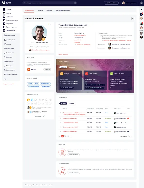 Еще одно отличие – в профиле сотрудника. В «1С-Битрикс24» он отображает общую информацию – имя, фото, должность, контактные данные, интересы и благодарности. Мы доработали раздел и создали полноценный личный кабинет сотрудника – единую точку доступа ко всем корпоративным сервисам. Это удобное решение, которое ускоряет внутренние процессы, упрощает работу персонала без доступа к ПК и снижает рутинную нагрузку на HR.