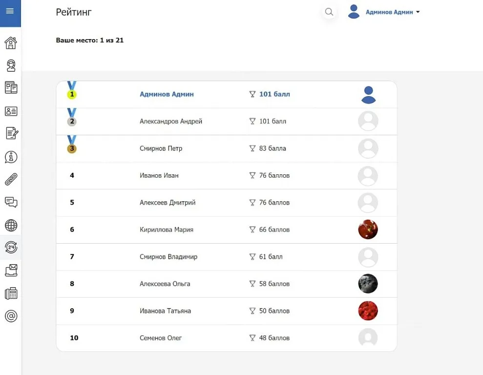 «Рейтинг пользователей». Отражает прогресс самых активных участников платформы с количеством полученных за прохождение курсов баллов.