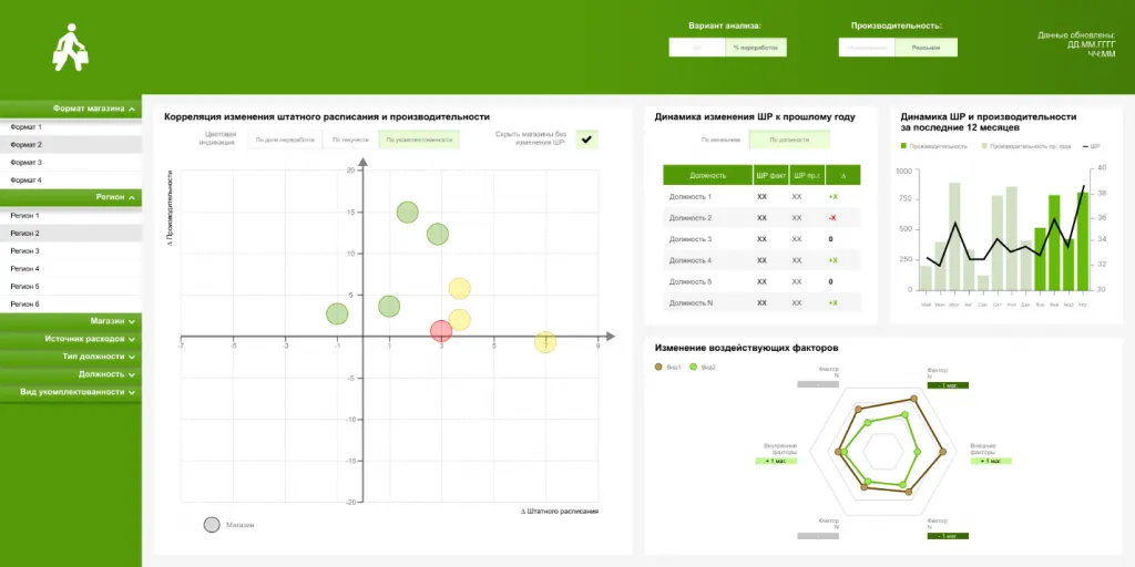 Чтобы избежать такой ситуации, руководство решило обратиться к данным. В рамках BI-системы мы создали единую информационную панель, предназначенную для этого совещания. На дашборде по каждому магазину можно посмотреть статистику за длительный срок и корреляцию между персоналом и продажами. Туда же добавлена информация о внешних факторах, влияющих на магазин, в том числе о конкурентных торговых точках, расположенных рядом.