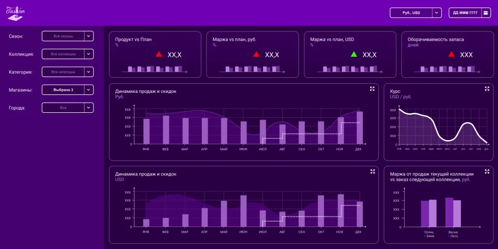 В сегменте fashion-ритейла есть особенность: коллекция закупается заранее и в валюте. Поэтому, когда принимается решение о распродаже, нужно единовременно иметь на руках всю информацию: стоимость коллекции на данный момент в валюте, стоимость коллекции на момент покупки в валюте, пересчет в рубли, а также рублевую и валютную маржу.