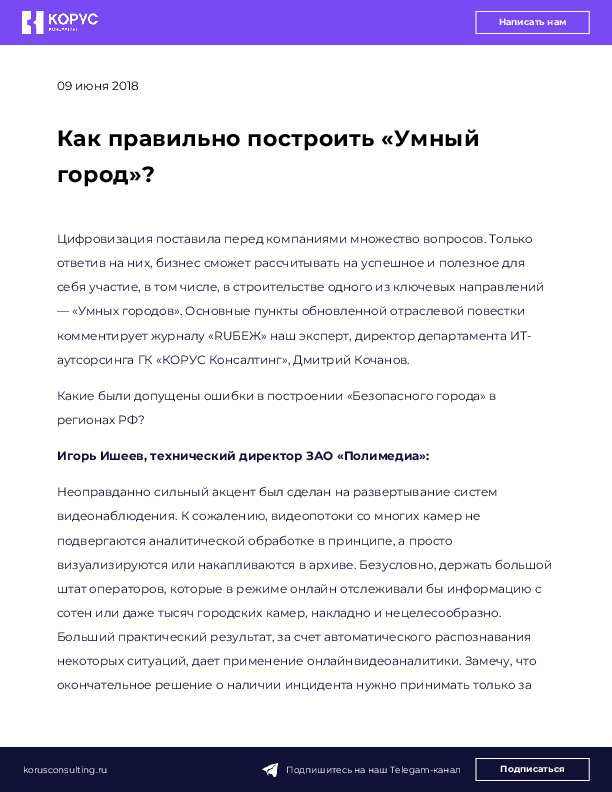 Цифровизация поставила перед компаниями множество вопросов. Только ответив на них, бизнес сможет рассчитывать на успешное и полезное для себя участие, в том числе, в строительстве одного из ключевых направлений — «Умных городов». Основные пункты обновленной отраслевой повестки комментирует журналу «RUБЕЖ» наш эксперт, директор департамента ИТ-аутсорсинга ГК «КОРУС Консалтинг», Дмитрий Кочанов.