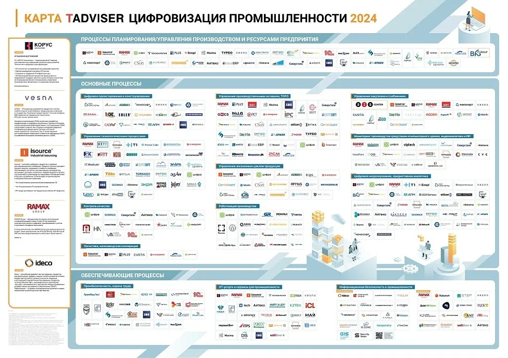 При наполнении карты аналитики использовали несколько источников информации, в частности, базу знаний об ИТ-проектах TAdviser, в том числе анкеты компаний и рейтинг крупнейших ИТ-поставщиков в промышленности, а также информацию с сайтов компаний-разработчиков ИТ-продуктов для промышленных предприятий.