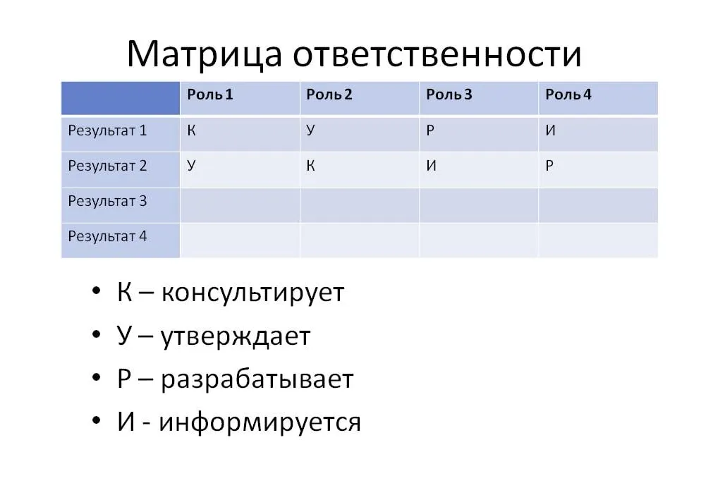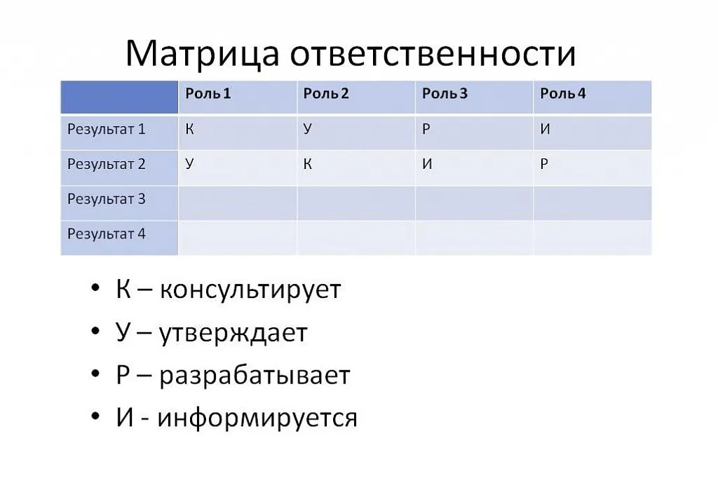 Матрица ответственности — помогает проджект-менеджеру и команде договариваться и разделять задачи, не терять ответственных и понимать, кто на каком этапе за что отвечает. Можно использовать в работе с любым процессом, не только со стейкхолдерами.