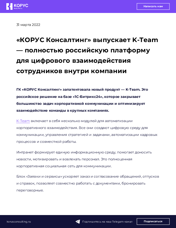 ГК «КОРУС Консалтинг» запатентовала новый продукт — K-Team. Это российское решение на базе «1С-Битрикс24», которое закрывает большинство задач корпоративной коммуникации и оптимизирует взаимодействие команды в крупных компаниях.