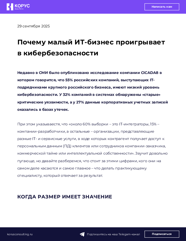 Таким образом, результаты исследования – это не «приговор» всей индустрии. Это четкий и своевременный сигнал большому бизнесу: быть более вдумчивым и требовательным к выбору партнеров, поскольку уровень организации внутренней информационной безопасности у небольших игроков часто не в приоритете.